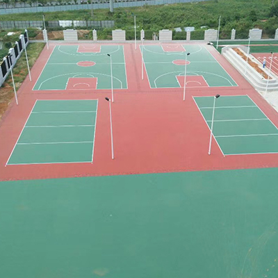 A、 籃球場(chǎng):第一層加15%(面漆重量計(jì)算)專(zhuān)用砂,用量約為0.15kg,第二層不加砂(用量約為0.1kg),加砂時(shí),應(yīng)先將色漆與面漆專(zhuān)用砂攪拌均勻,再加入固化劑攪拌均勻,再用水調(diào)節(jié)粘度;三秒禁區(qū)應(yīng)做兩層加砂的,一層不加砂(共3層)